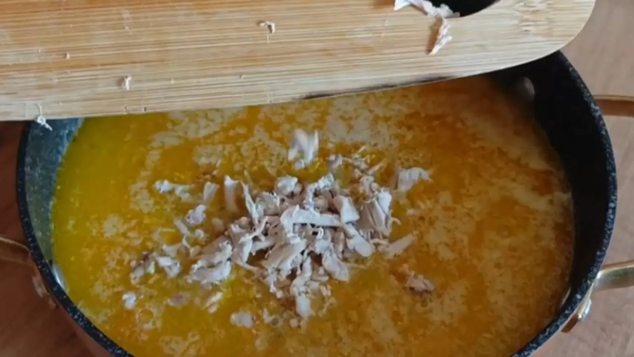 Kaynadıktan sonra 1 çay bardağı tel şehriye, haşlayıp didiklediğiniz tavuk eti ve 1 çay kaşığı karabiberi de ekleyin.