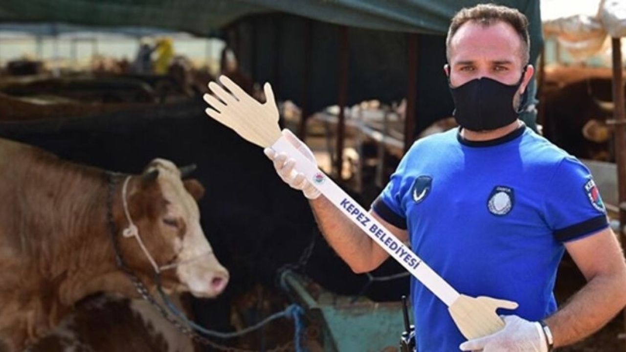 Belediye, kurbanlık alıcı ve satıcıları tarafından geleneksel hale gelen tokalaşmayı yapabilmesi için temsili tokalaşma eli tasarlayarak, içinde tek kullanımlık eldiven ve dezenfektan bulunan "Pazarlık kiti" hazırladı.