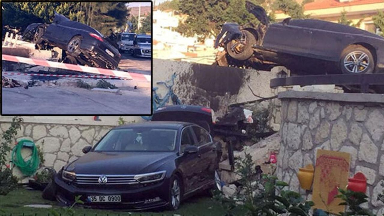 Park halindeki aracı, bir evin bahçe duvarını da yıkarak, evin bahçesine düşüren lüks araç, elektrik direğini de devirerek, bahçe duvarı üzerinde askıda kaldı.