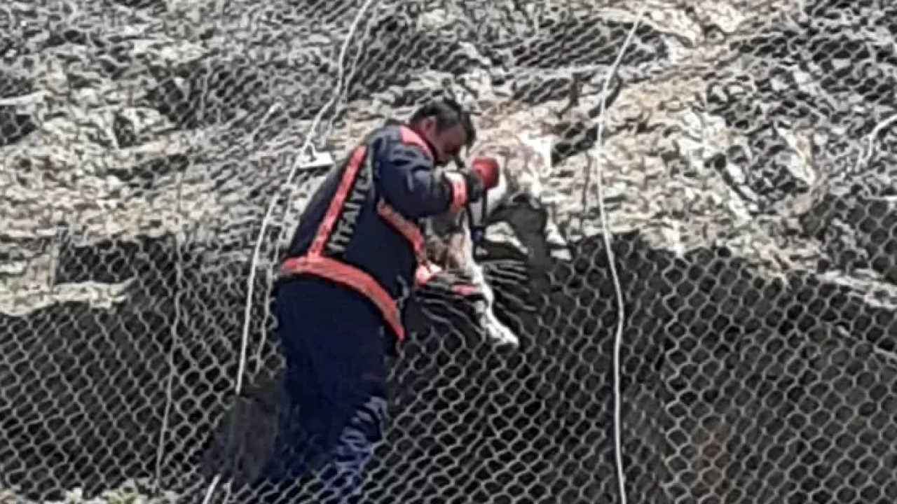 Pütürge ilçesine bağlı Poskıran Mahallesi'nde yola kaya parçaları düşmemesi için yamaç araziye serilen koruma teline 2 yaban keçisi takıldı.