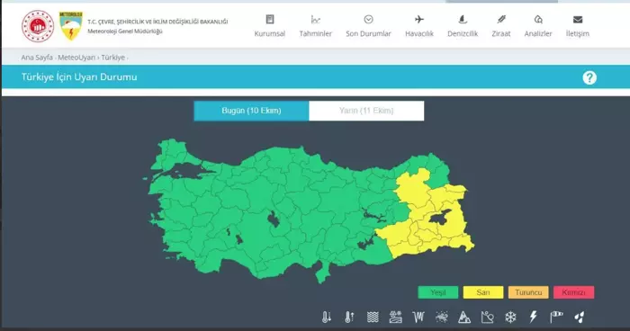 Meteoroloji 10 Ekim Salı gününe ilişkin hava durumu raporunu paylaştı. 12 il için sarı kodlu uyarı yapılırken yağışların Ağrı, Iğdır, Muş, Siirt ile Batman'da yer yer kuvvetli olması beklenirken, Bayburt, Erzurum'un yüksek kesimlerinde ise karla karışık yağmur bekleniyor