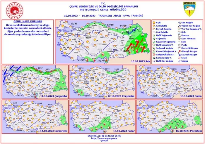 Yapılan son değerlendirmelere göre, yurdun kuzey, iç ve doğu kesimlerinin parçalı, yer yer çok bulutlu, Batı ve Orta Karadeniz kıyıları, Doğu Karadeniz, Doğu ve Güneydoğu Anadolu'nun doğusu ile Adana, Mersin, Osmaniye ve Hatay çevrelerinin yağışlı, diğer yerlerin az bulutlu ve açık geçeceği tahmin ediliyor.
