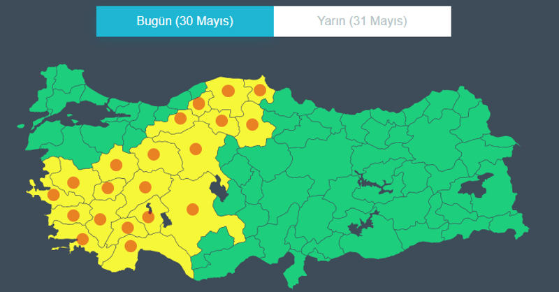 Meteroloji'nin uyardığı iller arasında Sinop, Kastamonu, Karabük, Çankırı, Çorum, Bolu, Ankara, Eskişehir, Konya, Kütahya, Afyonkarahisar, Antalya, Burdur, Isparta, Uşak, Manisa, İzmir, Aydın, Muğla ve Denizli yer aldı.