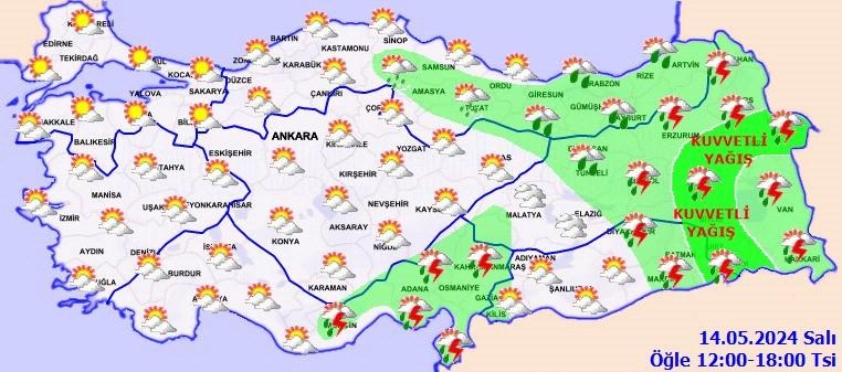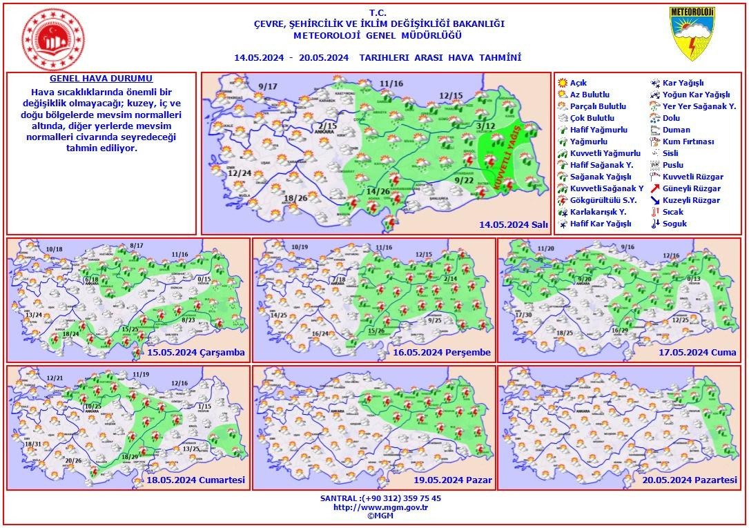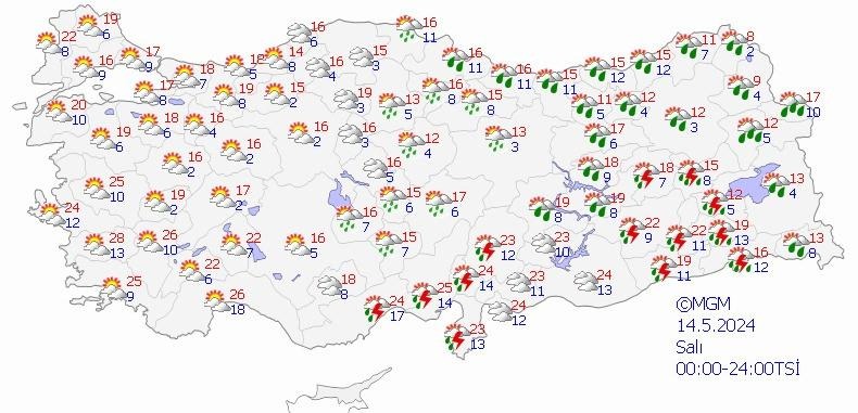 Meteoroloji Genel Müdürlüğü tarafından yapılan son değerlendirmelere göre, ülkemiz genelinin parçalı ve az bulutlu, doğusunun yer yer çok bulutlu, Doğu Akdeniz, Orta ve Doğu Karadeniz'in, Doğu Anadolu'nun kuzey ve doğusu ve Güneydoğu Anadolu’nun doğusu ile Yozgat ve Kayseri çevrelerinin sağanak ve yer yer gök gürültülü sağanak yağışlı geçeceği tahmin ediliyor. Yağışların; Hatay, Ağrı, Iğdır, Muş, Bitlis, Şırnak ve Siirt çevreleri ile Erzurum’un güney, Hakkâri'nin batı ilçelerinde yerel kuvvetli olması bekleniyor.