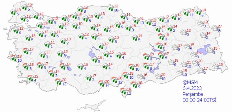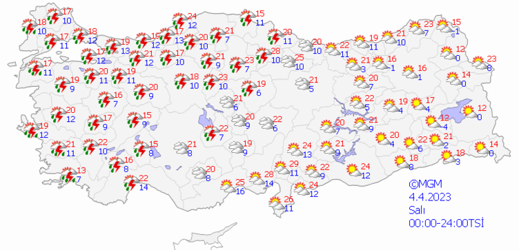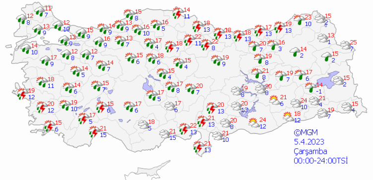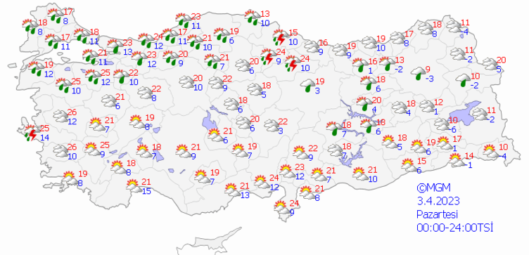 Meteoroloji Genel Müdürlüğü'nden alınan son verilere göre; yurdun genelinin parçalı ve çok bulutlu, Marmara'nın güney ve doğusu, Kuzey ve İç Ege, Akdeniz ve Batı Karadeniz ile Tekirdağ, Samsun, Çorum, Eskişehir, Çankırı, Ankara’nın kuzey ve batı ilçeleri, Aksaray, Niğde, Nevşehir, Kayseri, Gaziantep ve Kilis çevrelerinin aralıklı sağanak yağışlı geçeceği tahmin ediliyor.