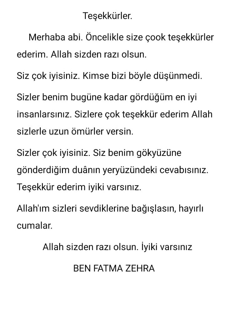 Gözyaşları içinde yaşadıklarını anlatan Fatma Zehra kendisine yardım eli uzatan hayırseverlere seslenerek, ”Dünyada bize yardım gönderen insanlar kadar iyileri görmedim. Allah onlardan razı olsun hepsine çok teşekkür ederiz. Annem ve babamdan sonra bizi kimse bu kadar sevmemişti. Büyüyünce Başhekim olmak istiyorum. Okuluma çok özledim okuluma gitmek istiyorum” diye konuştu.