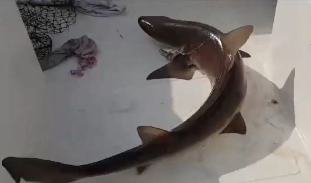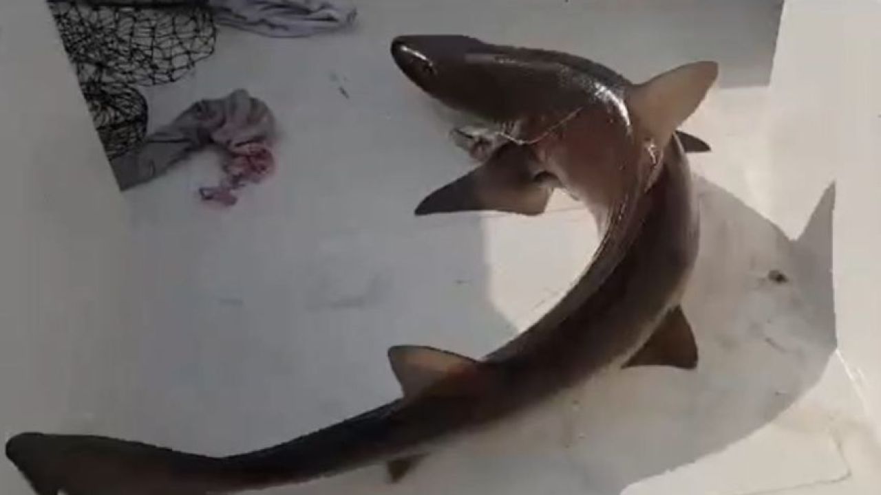 Köpek balığını görünce şaşıran amatör balıkçılar balığı tekneye aldı. Bir süre sonra köpek balığını denize geri bırakan balıkçılar avlarını tamamlayarak geri döndü.