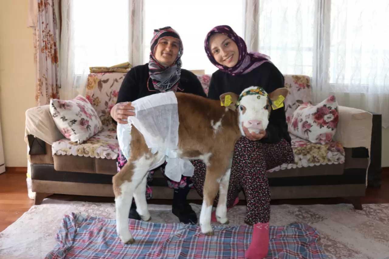 61 yaşındaki Zeynep Aksoy ise "Nisan"ı evin bir ferdi gibi görmeye başladıklarını belirterek, "Normalde iki kişiyiz anneli, kızlı yaşıyoruz ama şimdi Nisan ailemizin üçüncü üyesi oldu. O da yavrumuz, danamızla çok ilgileniyoruz, onu çok seviyoruz. Emziriyoruz, yediriyoruz, içiriyoruz. Yatağımıza alıp, yatırıyoruz, bezliyoruz." diye konuştu.