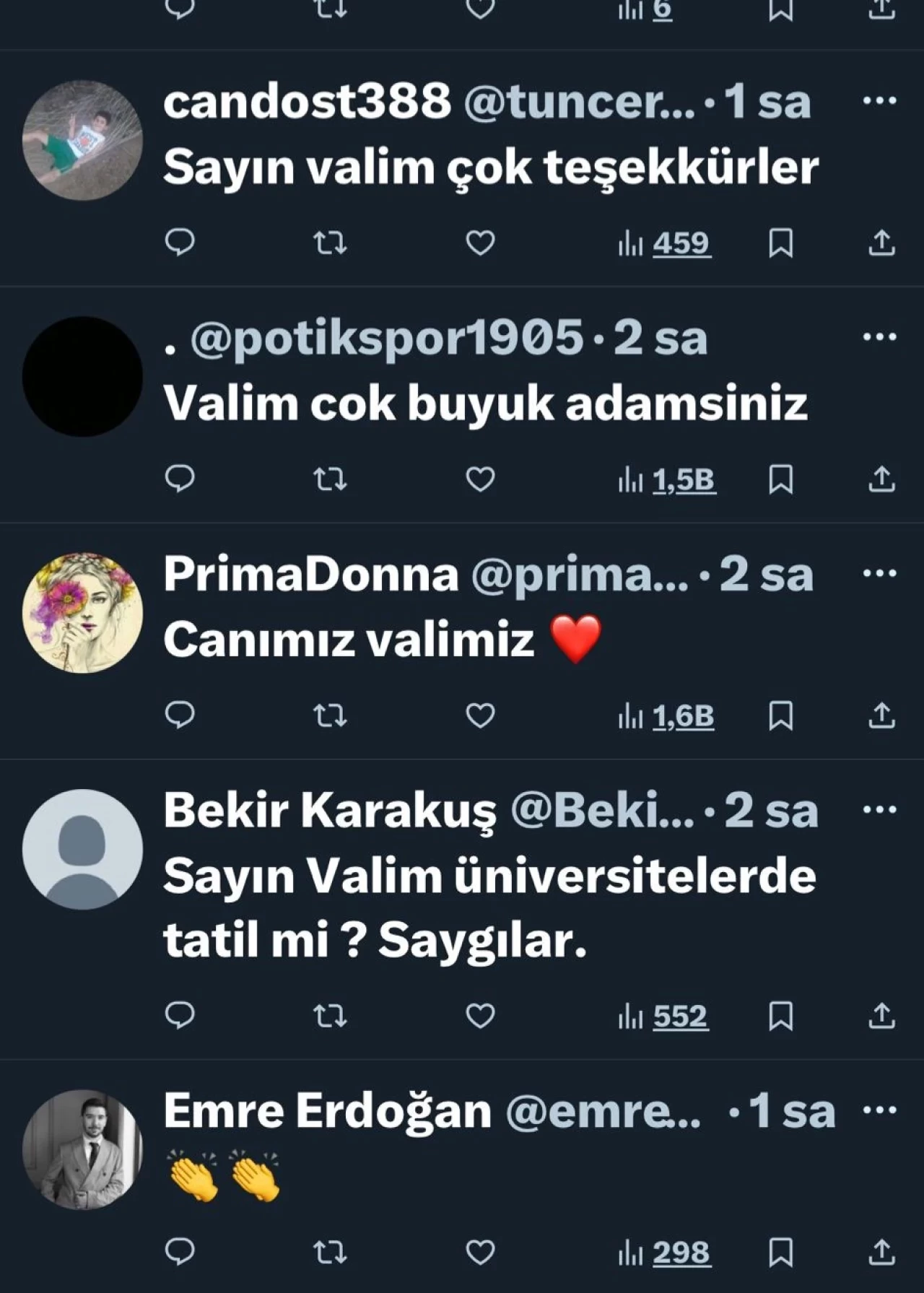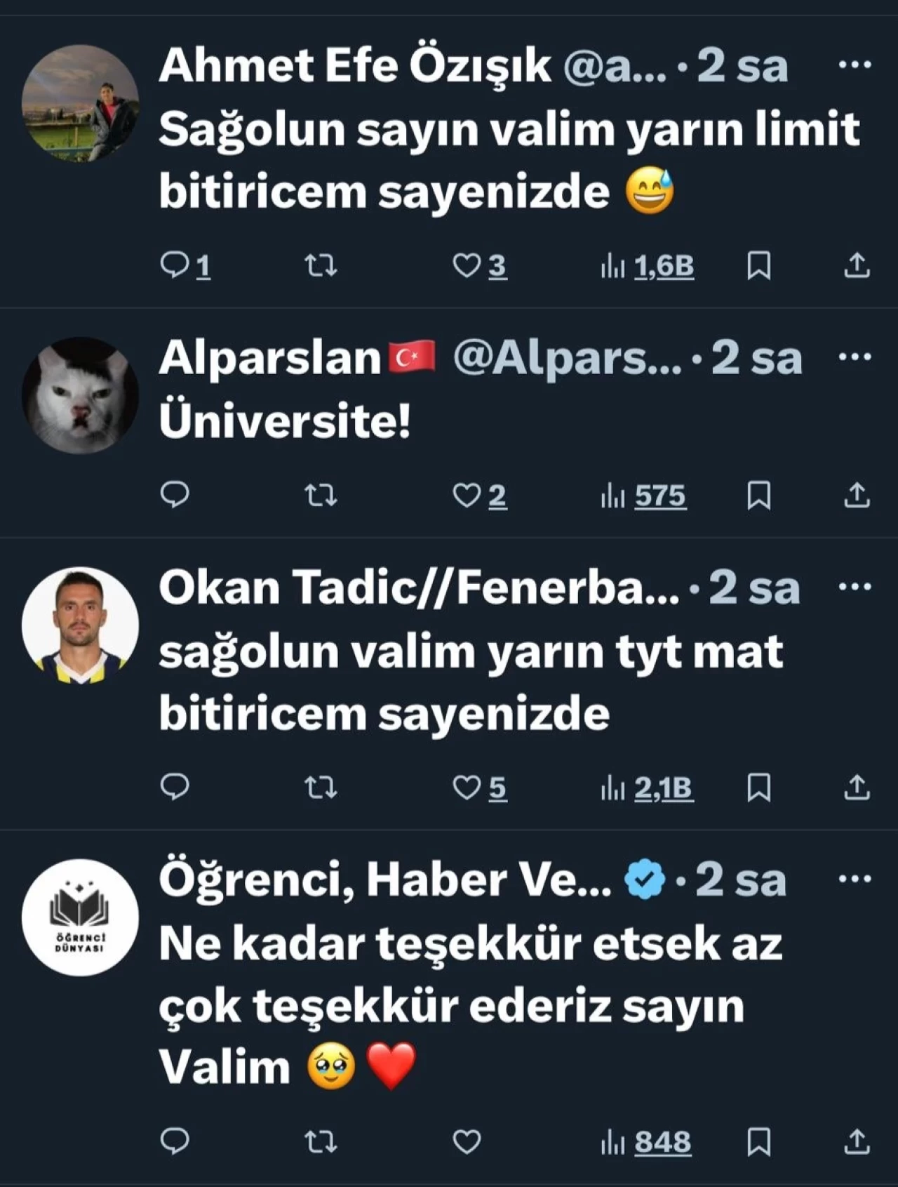 Kayseri'de gece saatlerinde etkisini gösteren kar yağışı nedeniyle kent genelinde okullar 1 gün tatil edildi. Sosyal medya hesabından tatili duyuran Kayseri Valisi Gökmen Çiçek'in paylaşımına öğrenciler tarafından yapılan yorumlar ise güldürdü. "Canımız Valimiz", "Valim çok büyük adamsınız", "Dualarım kabul oldu, Allah razı olsun valim", "Sağ olun Valim, yarın TYT matematik bitireceğim sayenizde", "Baba ya baba" gibi yorumlar yapan öğrencilerin sözleri güldürdü.