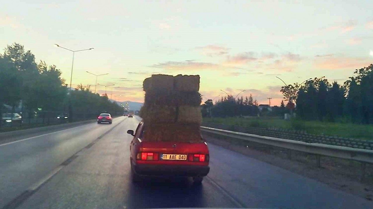 Bursa’nın İnegöl ilçesinde bir sürücü, aracının üzerinde saman balyaları taşıdı. O anlar amatör kameraya saniye saniye yansıdı.