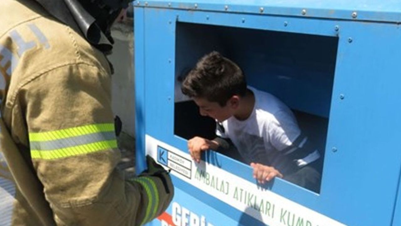 Geri dönüşüm kutusundan gelen yardım seslerini duyan çevredekiler durumu itfaiyeye bildirdi. Kısa sürede olay yeren itfaiye ekipleri, kapağı açarak çocuğu kurtardı.