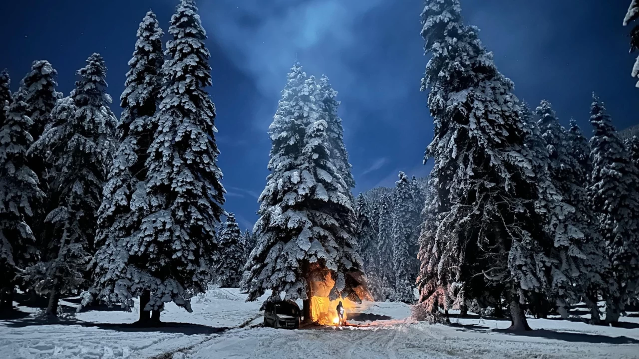 Kamp yapmak için yaylaya giden Oğuzhan Çakır karla kaplı bölgede yiyecek bulamayan tilkiyi elleriyle besledi.