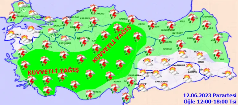 Meteoroloji Genel Müdürlüğü tarafından yapılan son değerlendirmelere göre; Ülkemiz genelinin parçalı yer yer çok bulutlu, Marmara'nın kuzey ve doğusu, Ege, Akdeniz, İç Anadolu, Karadeniz, Doğu Anadolu’nun kuzeyi ile Van çevrelerinin aralıklı ve yerel olmak üzere sağanak ve gök gürültülü sağanak yağışlı geçeceği tahmin ediliyor. Yağışların; İç Ege, Akdeniz'in iç ve batı kesimleri, İç Anadolu’nun güney ve doğusu, Orta Karadeniz ile İzmir, Aydın ve Muğla'nın iç kesimlerinde yer yer kuvvetli olması bekleniyor.