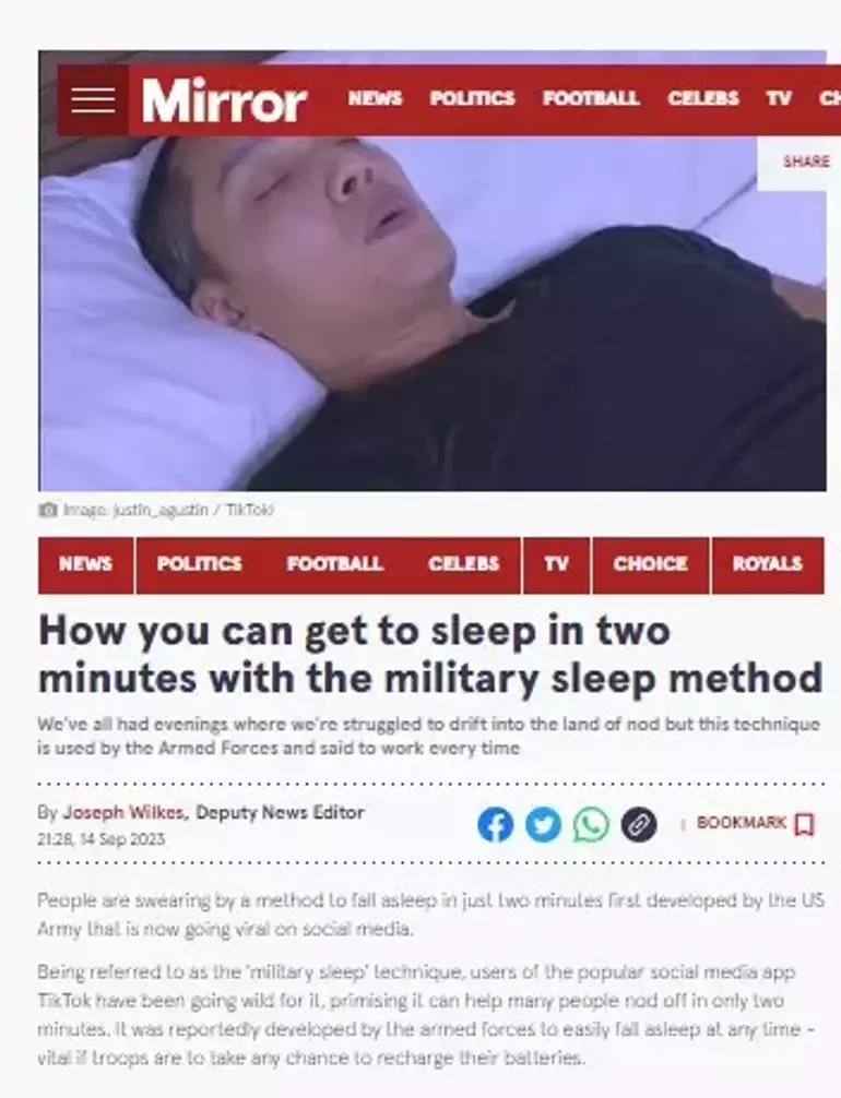 İngiliz Mirror gazetesi 'askeri uyku' tekniğinin silahlı kuvvetler tarafından herhangi bir zamanda kolayca uykuya dalmak için geliştirildiği, bunun askerlerin enerjilerini tekrardan toparlayabilmeleri için hayati önem taşıdığını yazdı.