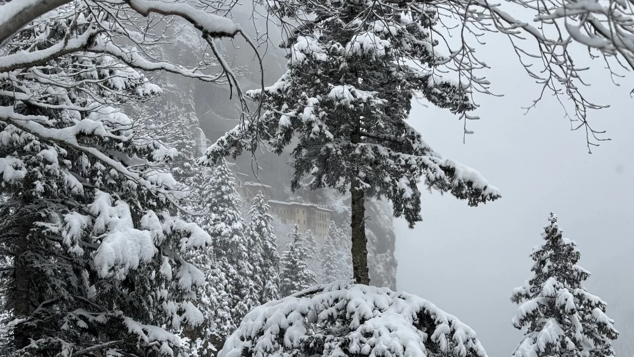 Karadağ'ın Altındere Vadisi'ne bakan eteğinde, vadiden yaklaşık 300 metre yükseklikteki ormanlık alanda kayalar oyularak yapılmış, halk arasında "Meryem Ana" adıyla bilinen Sümela Manastırı da etkili olan yağışın ardından beyaza büründü.