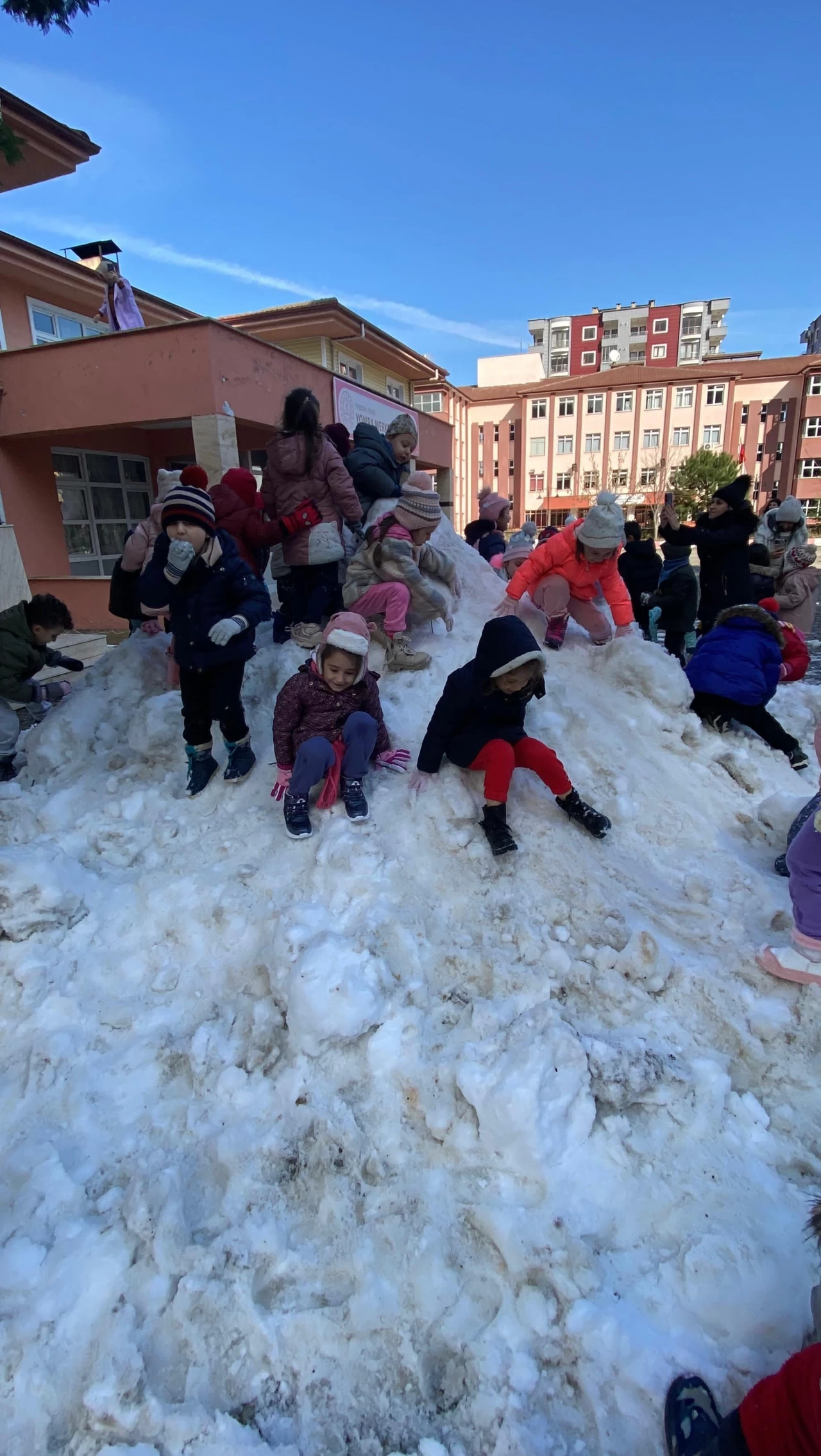 Yomra Belediyesi'ne ait kamyona kar yüklenerek okul bahçesine getirildi. Öğrenciler, keyfini çıkarmak için dışarı çıktılar ve kar topu oynamaya başladılar.