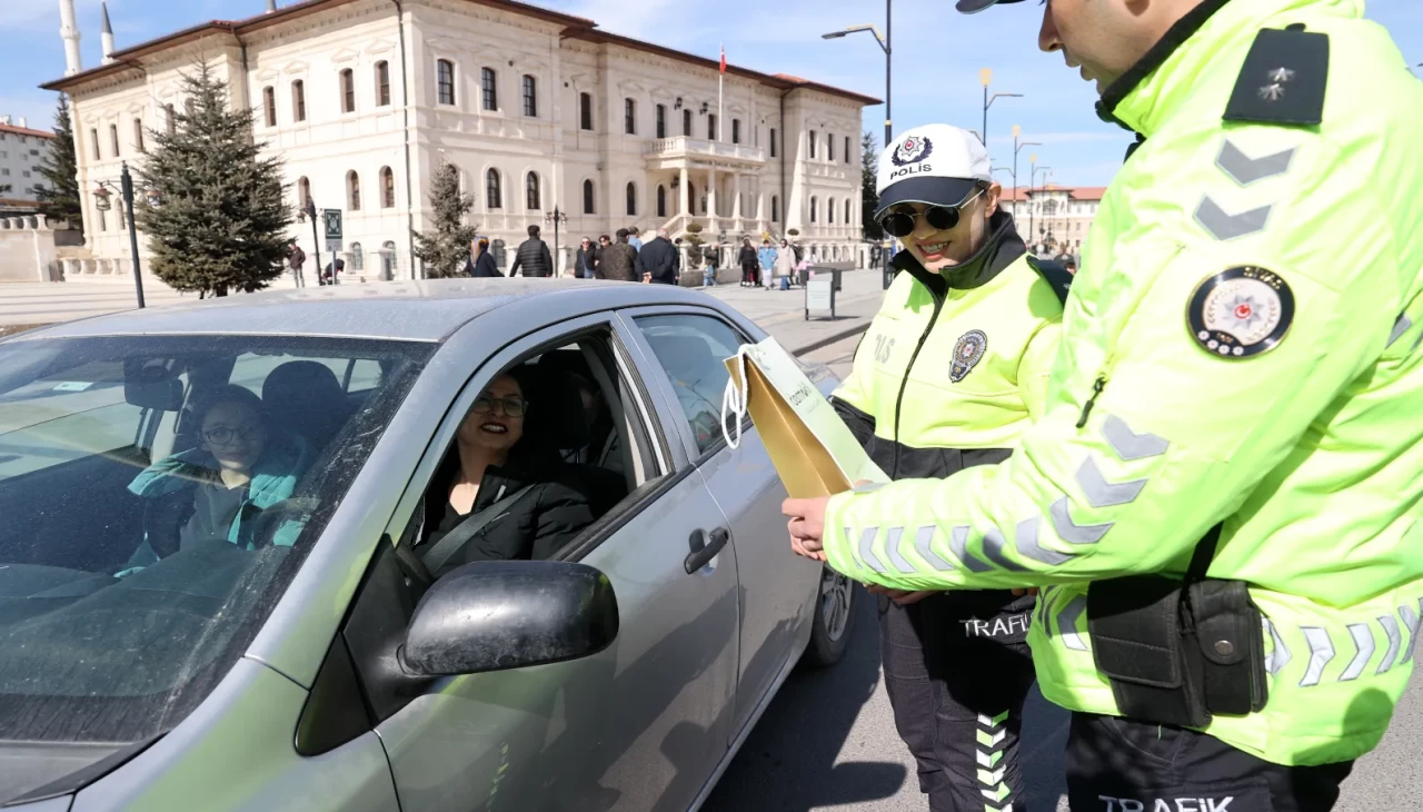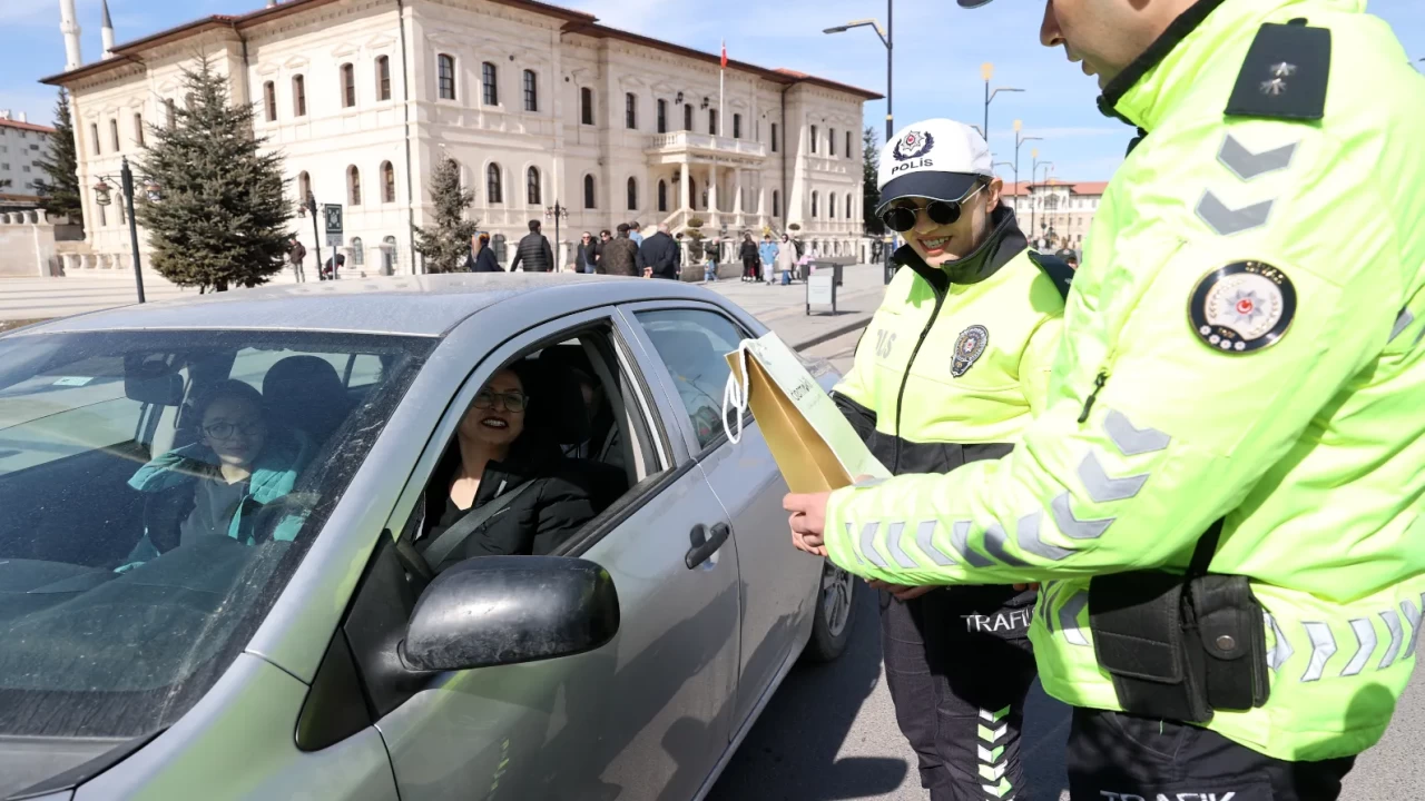 Sivas İl Emniyet Müdürlüğü Trafik Tescil ve Denetleme Şubesi ekipleri, 8 Mart Dünya Kadınlar Günü'nde anlamlı bir etkinlik gerçekleştirdi. İnönü Bulvarı Atatürk Kongre Müzesi önündeki uygulama noktasında kadın sürücüler durdurularak hediyeler verildi.