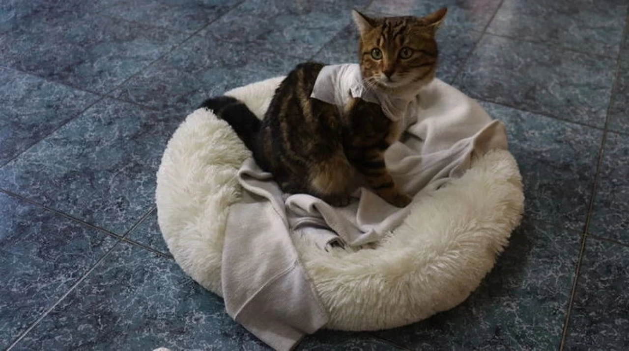 Sol ön bacağında alçı bulunan ve kemikleri yanlış kaynayan, açık kırık ve enfeksiyon gibi rahatsızlık belirtileri gösteren kedinin tedavisi için harekete geçen Çelik, ilk muayenenin ardından sol ön bacağını ampute ettiği kediyi kısırlaştırma işlemi yaptıktan sonra sahiplendi.