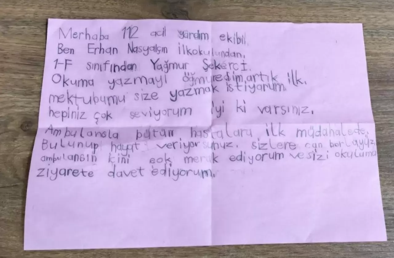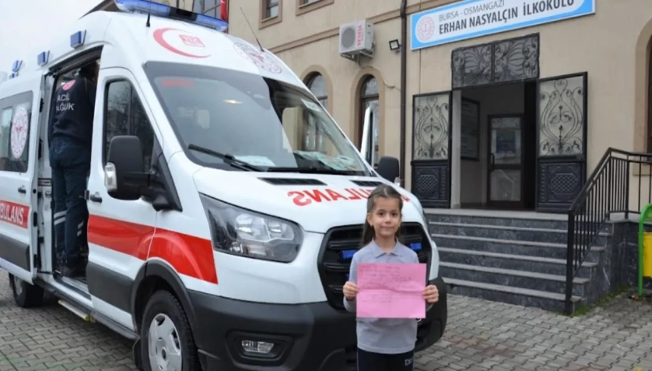 Bursa'nın Osmangazi ilçesinde Erhan Nasyalçın İlkokulu 1’inci sınıf öğrencisi Yağmur Şekerci’nin en büyük hayali sokaklarda siren sesini duyduğu ambulansı yakından görmekti. Bu hayalini bilen ailesinin, Bursa 112 Acil Sağlık Hizmetleri İl Ambulans Servisi Başhekimliği'ne hitaben bir mektup yazmasını söylediği Yağmur, okuma yazmayı öğrenir öğrenmez en büyük isteğini kaleme aldı. Mektubu yerine ulaştığında da İl Sağlık Müdürlüğü yetkilileri bu isteği karşılıksız bırakmadı.