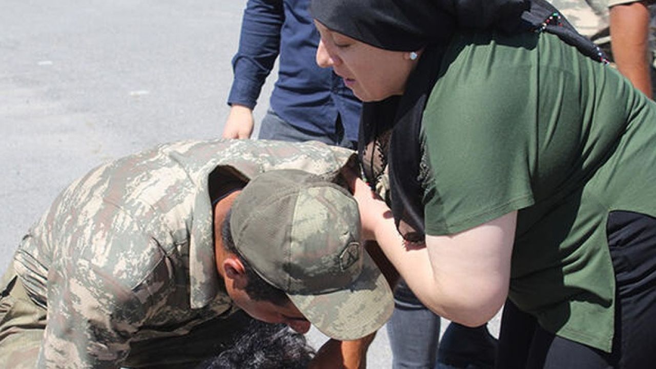 Bu sırada diğer arkadaşlarının ailesine sarıldığı gören bir asker ise çömelerek ağlamaya başladı.