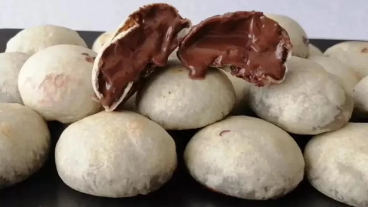 Dinlendirdiğiniz hamurdan küçük bezeler koparın. Bu bezeleri unlu bir zeminde merdane yardımıyla açın. Her bir açtığınız hamurun ortasına sürülebilir çikolata koyarak, kenarlarını büzün ve kapatın. Bu adımda hamurun iç kısmındaki çikolatanın dağılmaması için dikkatli olun.