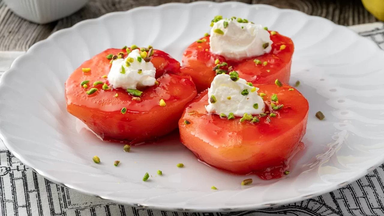 Ayva tatlısını tencerede, tamamen doğal şekilde hazırladık. Gıda boyası kullanmadan kendi rengini koruyan tatlıyı, üzerine lezzetli kaymak ekleyerek servis ettik. Şerbetli olmasına rağmen hafifliğiyle şaşırtacak. Kış bitmeden ayva tatlısını denemeyen kalmasın! Hazırlıklar için başlayın.