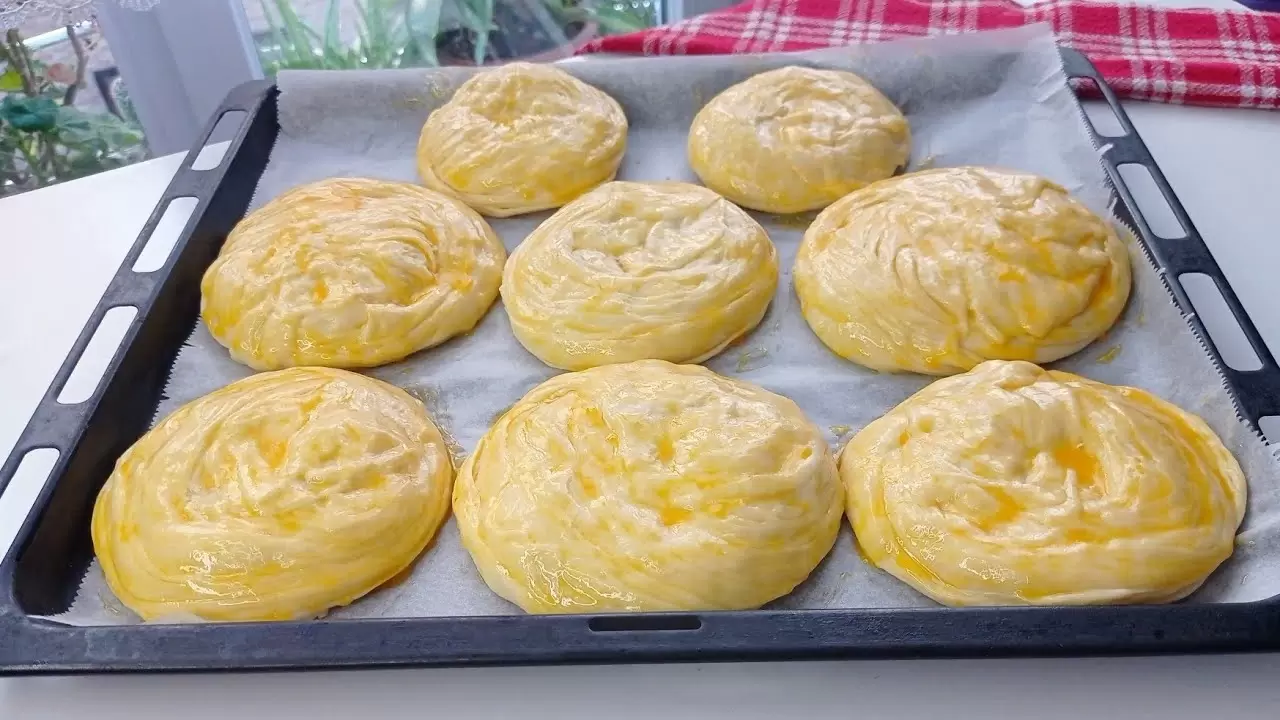 Hamur malzemelerini karıştırıp yumuşak bir kıvam alıncaya kadar yoğurun. Üzerini örtüp yarım saat dinlendirin. İç harcı için unu kavurun, ardından tereyağını ekleyin. Hamuru bezelere ayırın, her birini açın, tereyağıyla yağlayın, iç harcı serpiştirin ve katlayın. Fırın tepsisine dizip 180 derecede üzeri altın rengi oluncaya kadar pişirin.
