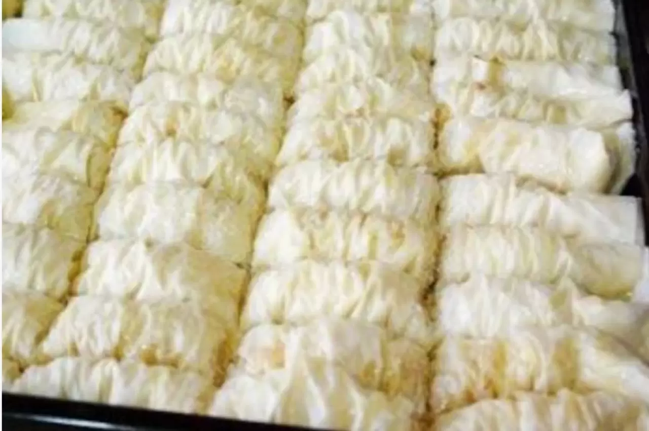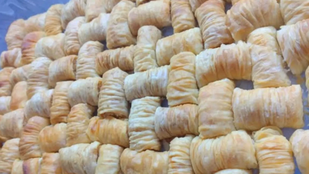 Dinlenen hamuru küçük bezelere bölün. Her bezeyi ince bir şekilde oklavayla açın. Hamurun bir ucuna hazırladığınız iç harcı uzun bir çizgi halinde yerleştirin.