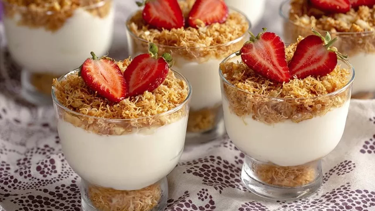 Servis kuplarının tabanına kadayıf karışımından bir kat koyun, üzerine muhallebiyi ekleyin ve tekrar kadayıf ile kaplayın. Çileklerle süsleyin.