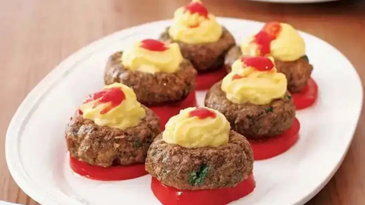 - Birleştirme: Fırından çıkan köfte kaselerine patates püresini kaşıkla paylaştırın. Üstlerine rendelenmiş kaşar serpin. Tepsiye sosu, köftelerin aralarından gezdirin (üzerine değil).