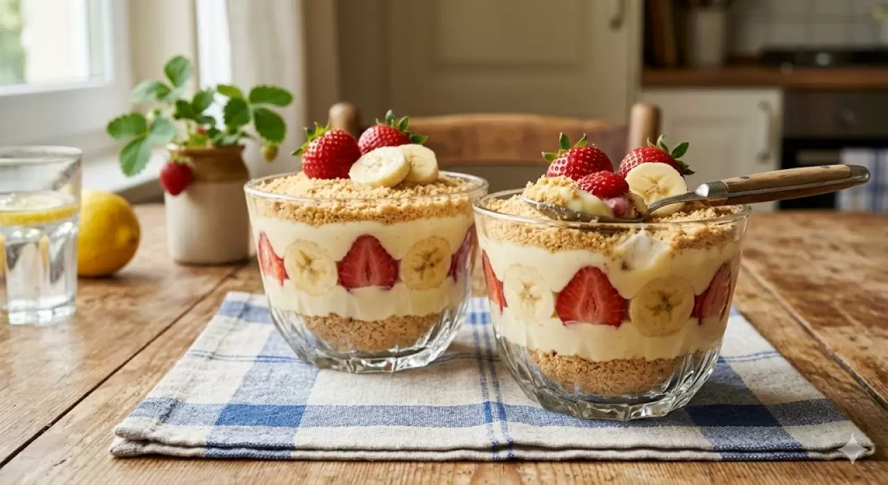 - Kupların tabanına bisküvi koyun, kenarlara meyve dilimleri dizin. Üzerine muhallebiyi paylaştırın ve en üste tekrar bisküvi serperek soğumaya bırakın.