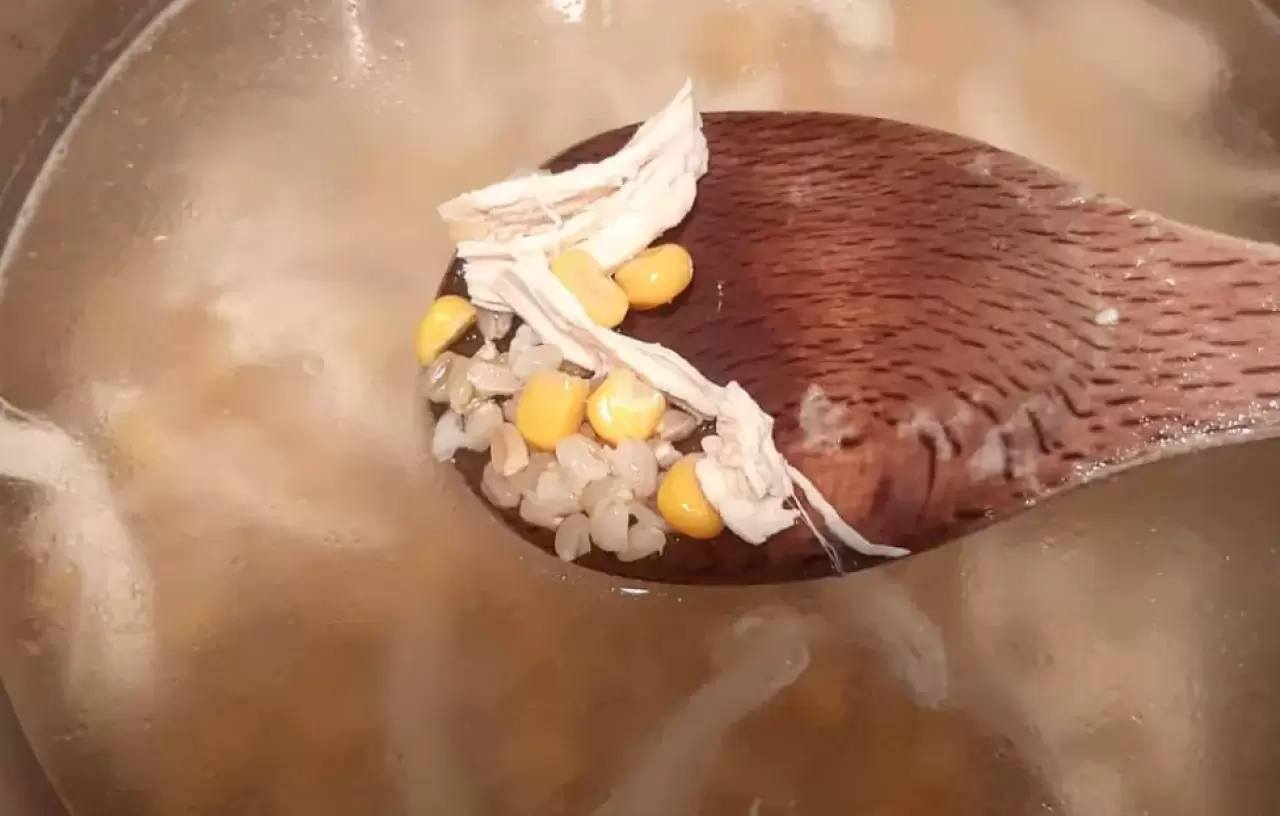 Tavuk göğsü sade bir şekilde haşlanır. Piştikten sonra didiklenir, suyu süzülür ama dökülmez; çünkü çorbanın asıl tadı oradadır.