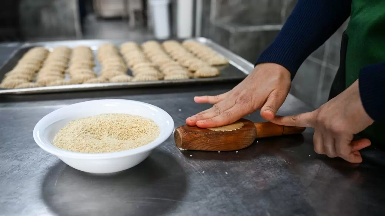 Dinlenen hamurdan alınan parçalar önce susama batırılır. Ardından Hatay’a özgü, üzerinde çeşitli motifler bulunan geleneksel tahta kalıba yerleştirilerek bastırılır. Hamur, kalıbın şeklini aldıktan sonra sertçe bir zemine vurularak çıkarılır.