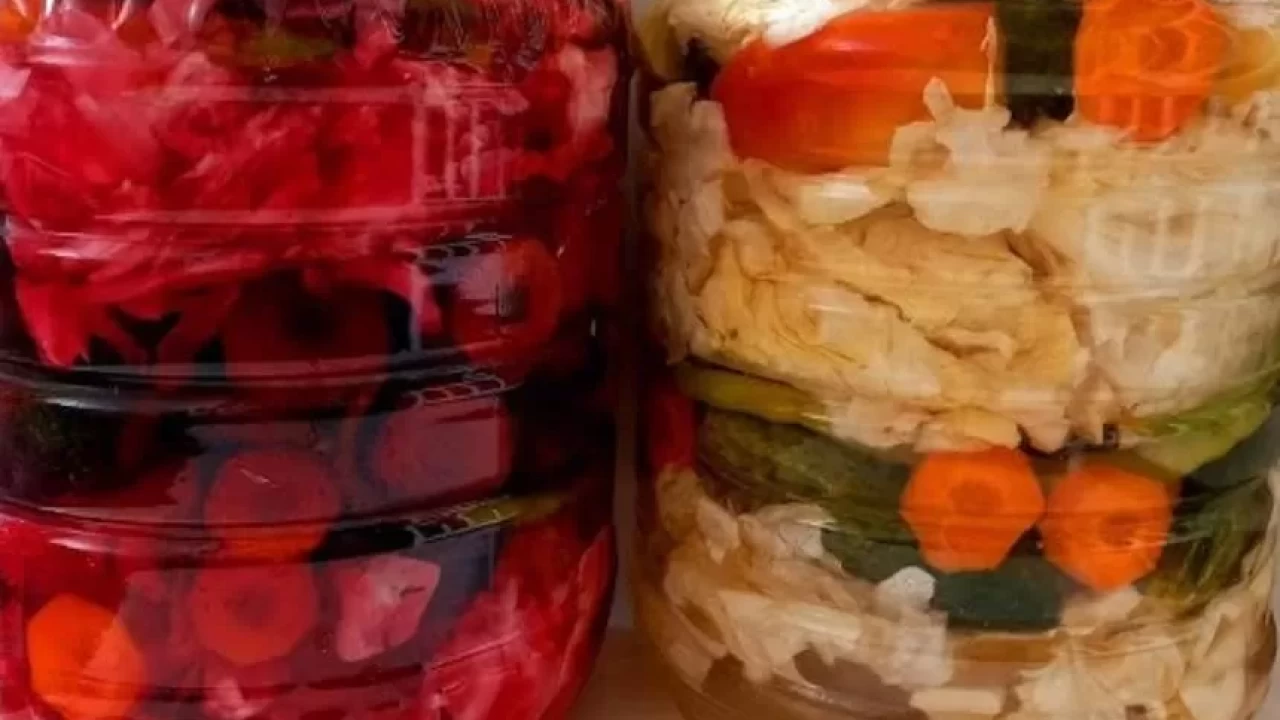 Büyük bir cam kavanozun dibine birkaç sarımsak bırakılır. Ardından lahana, havuç, biber ve salatalıklar kat kat yerleştirilir.