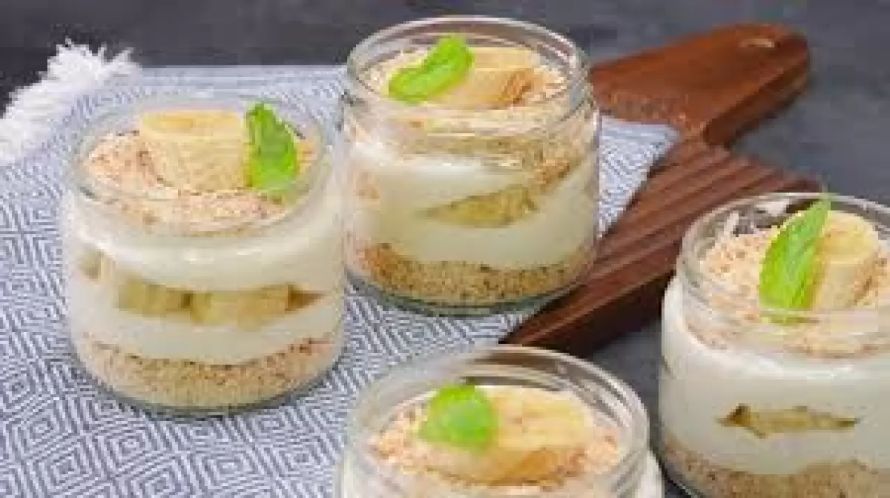 - Kat kat oluştur: Servis kaselerinin tabanına bisküvi kırıntısı koy, ardından kremayı dök. Üzerine dilimlenmiş muz ekle. Bu katmanları malzemeler bitene kadar tekrarla.
