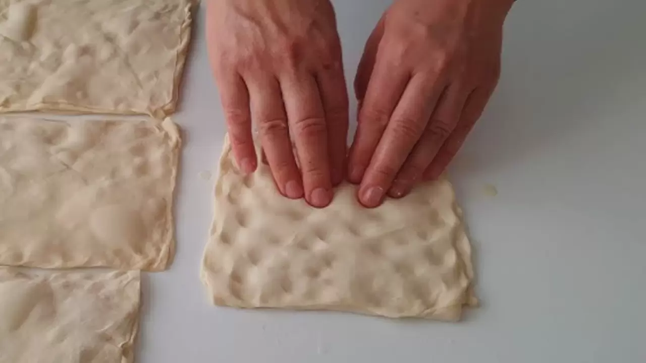 İkinci hamur parçasını da aynı şekilde açın ve iç harcın üzerine kapatın. Kenarlarını elinizle bastırarak birleştirin.