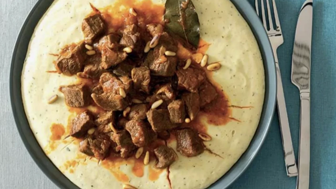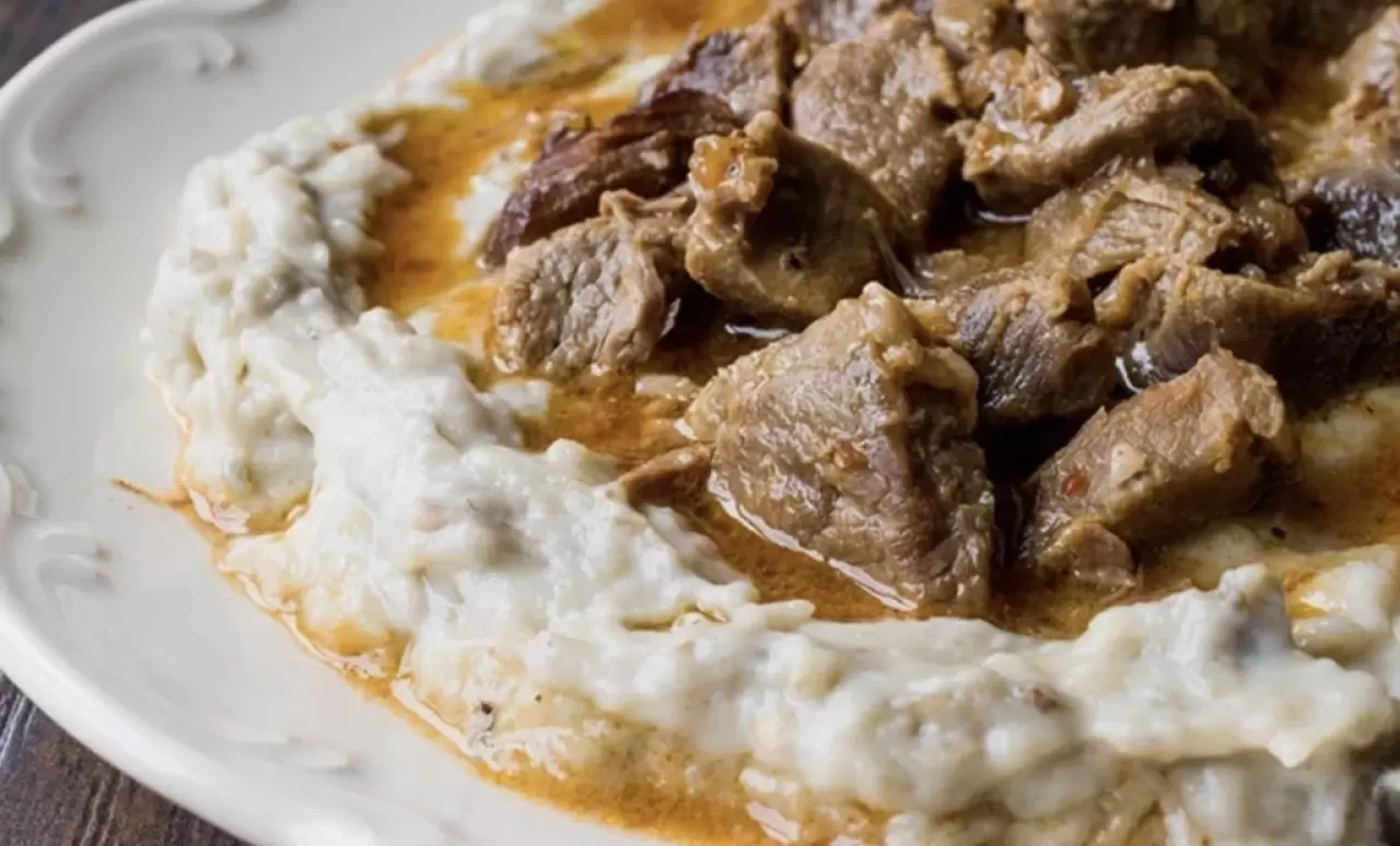 Servis tabağının altına beğendiyi yayın. Üzerine pişmiş etleri ekleyin.