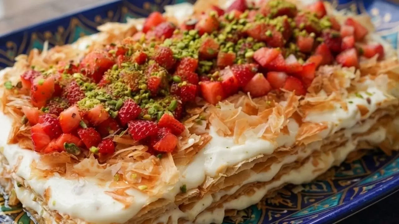 Küp küp doğranmış taze çilekleri ve Antep fıstıklarını üzerine cömertçe ekleyin. Servis anına kadar çıtırlığını koruması için hemen tüketilmesi önerilir.