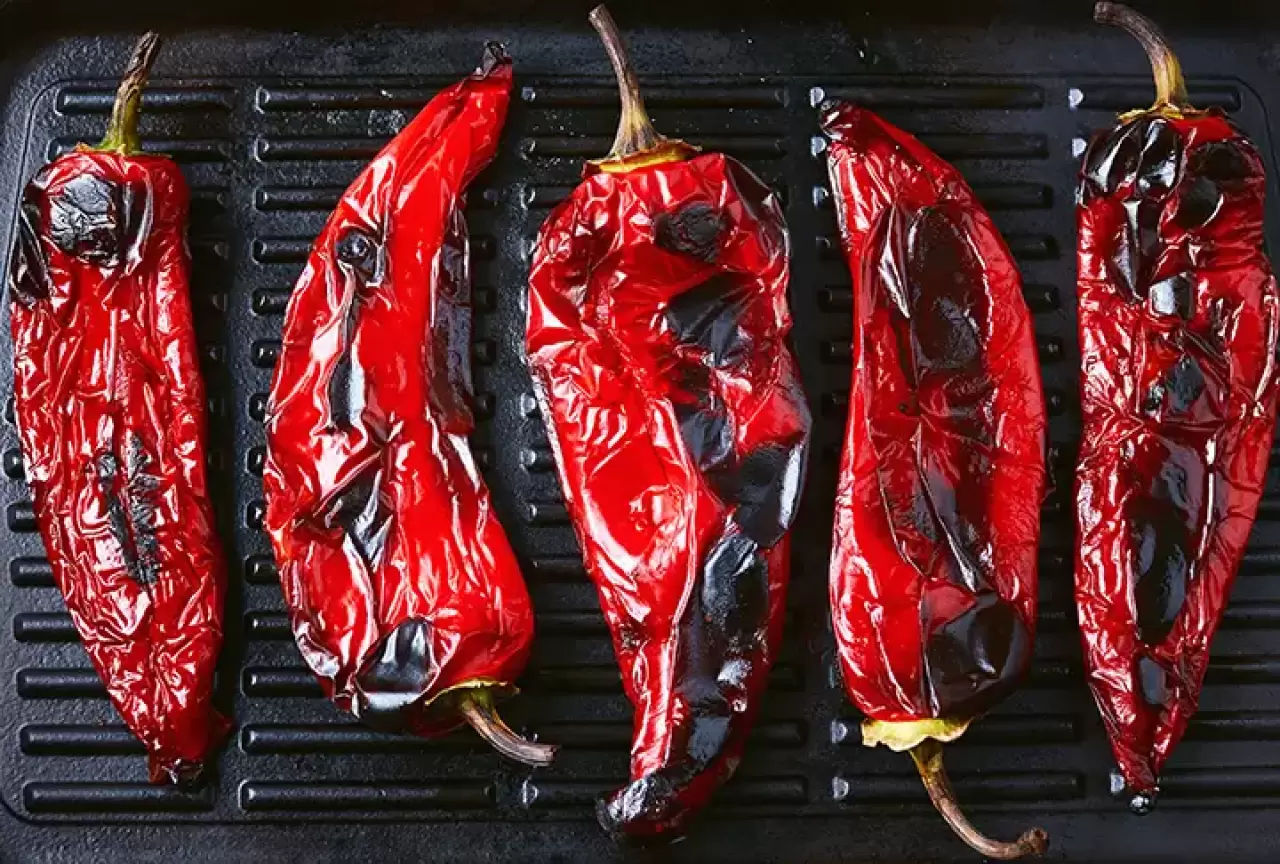 Önce biberleri közleyin. Fırında, ocakta ya da airfryer’da fark etmez; kabukları iyice yanıp buruşana kadar pişsin. Közlenen biberleri bir kaba alıp üzerini kapatın, birkaç dakika kendi buharında beklesin. Bu küçük mola, kabuklarını soyarken işinizi çok kolaylaştırır.