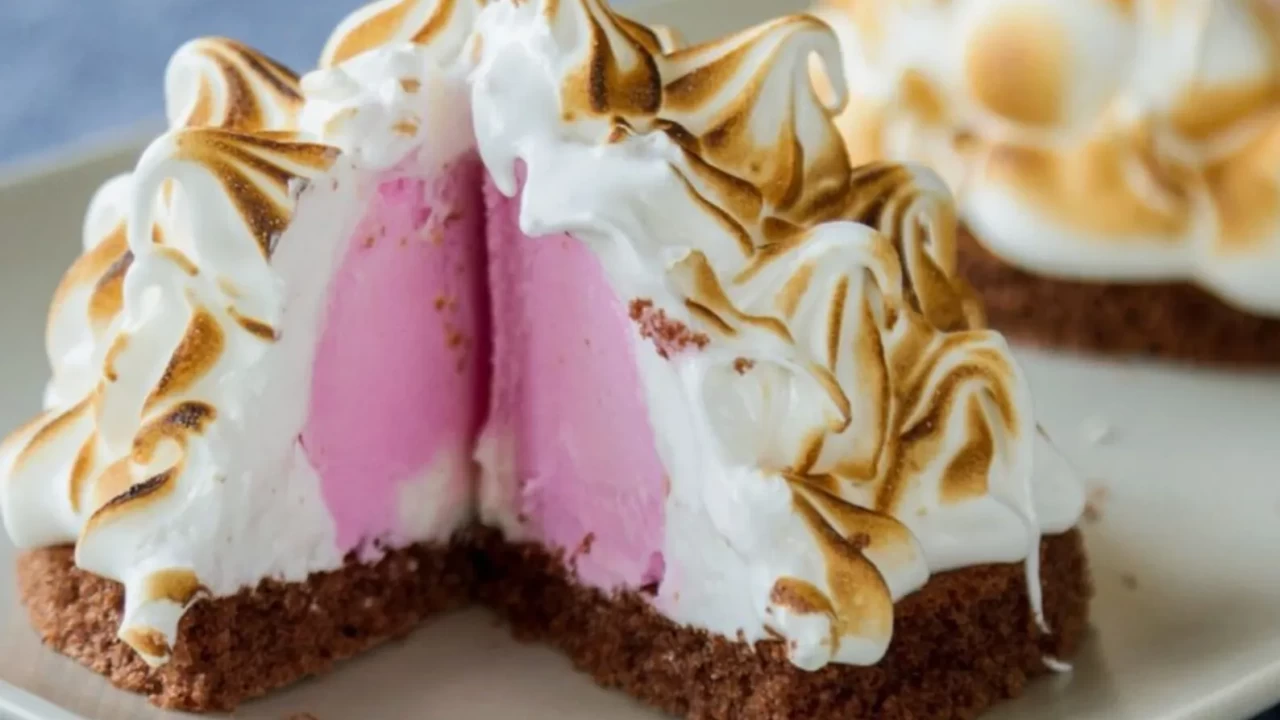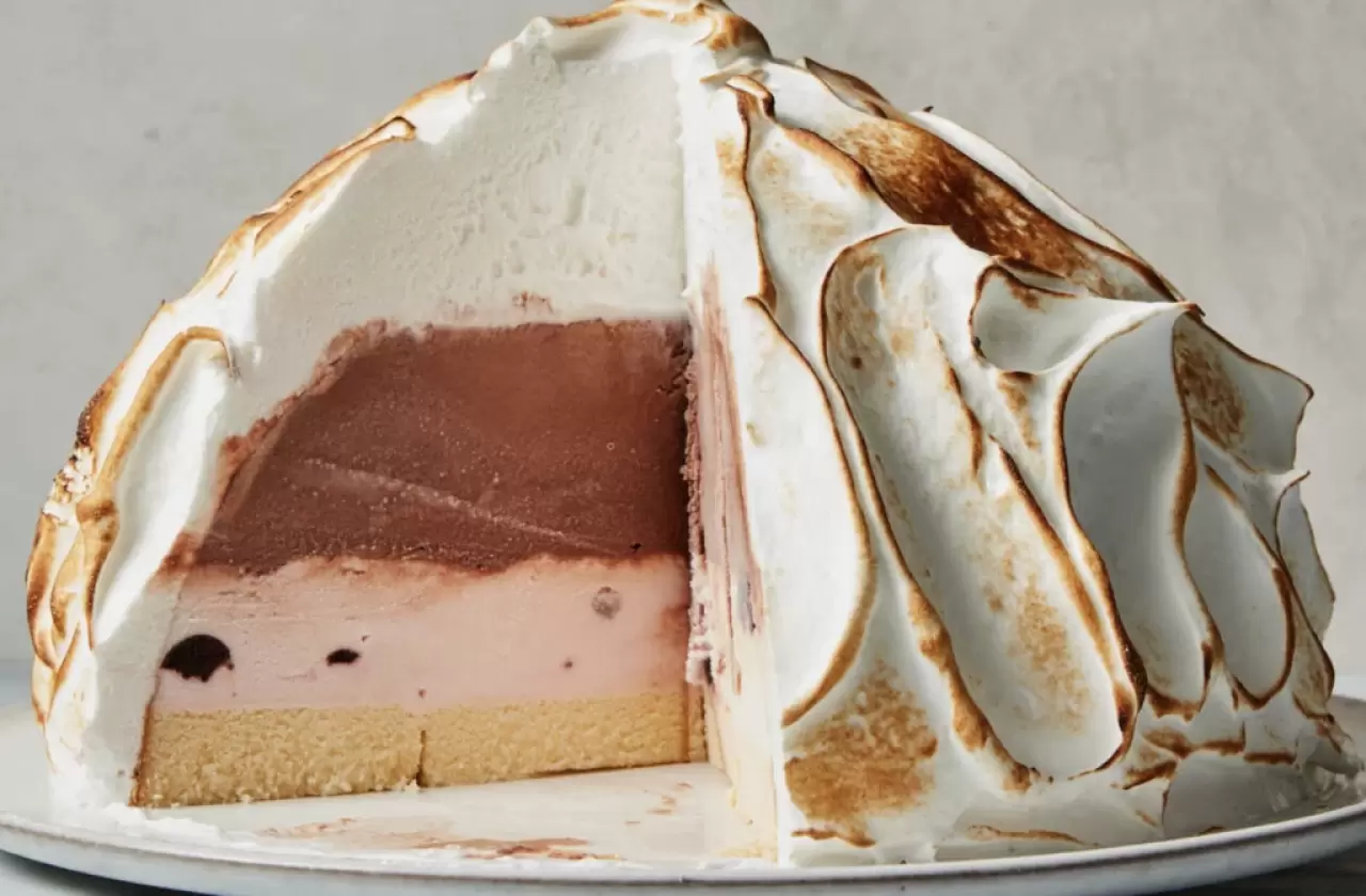 Dışı alevle hafifçe kızartılmış beze, içi kat kat dondurma, en altında ise yumuşacık bir kek tabanı… Hem gösterişli hem de tam anlamıyla “yapması cesaret isteyen” bir tatlı.